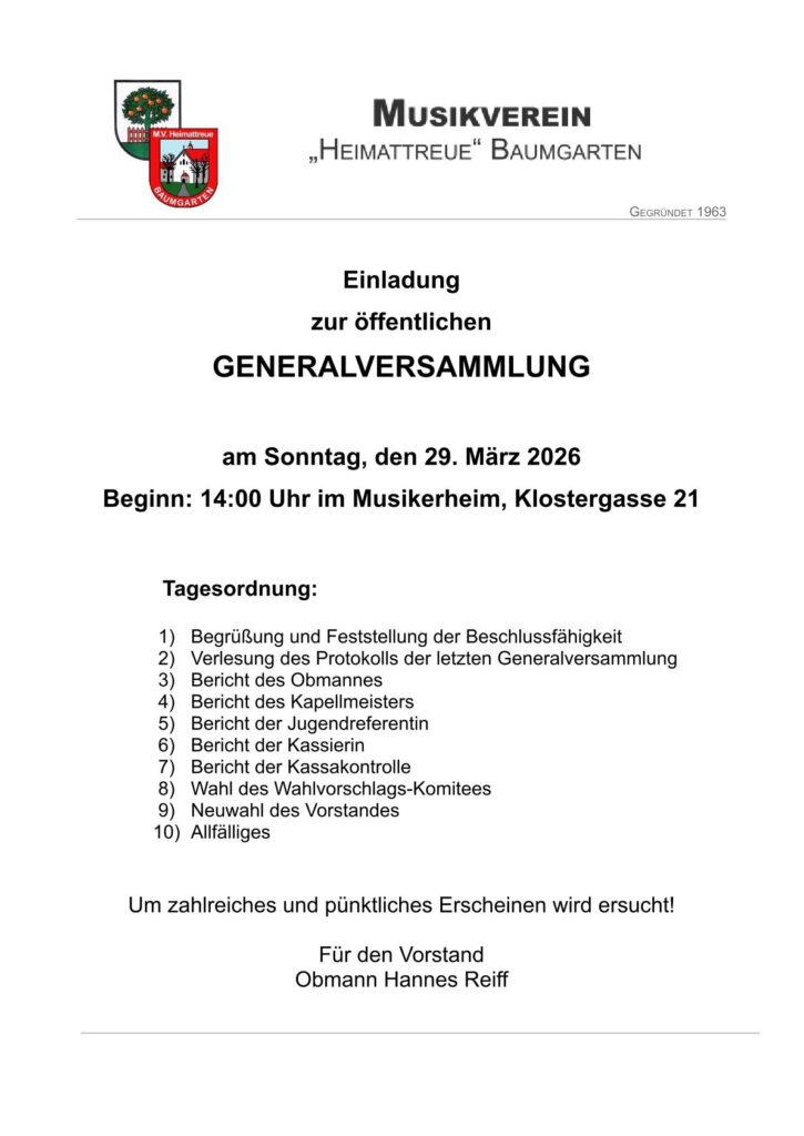 Der Musikverein „Heimattreue“ Baumgarten lädt alle Mitglieder und Interessierten herzlich zur öffentlichen Generalversammlung ein!